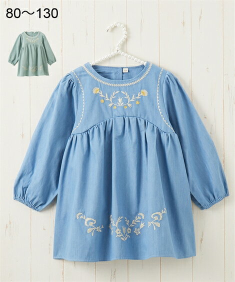 ワンピース キッズ 女の子 刺しゅう入り チュニック 子供服 ジュニア服 サックス/モスグリーン 身長100/110/120/130cm ニッセン nissen
